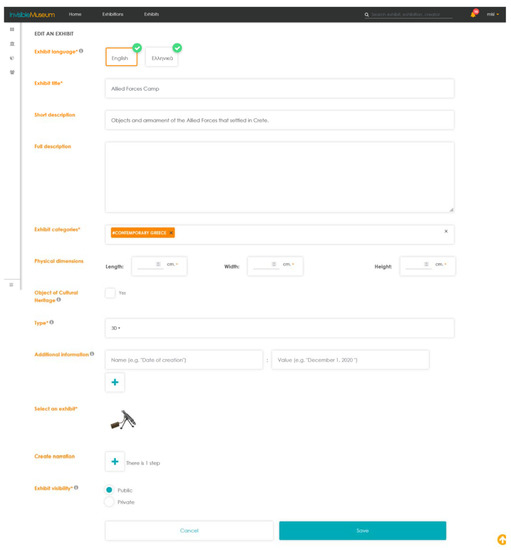 Figure 8. In the form, the details of the exhibit are provided, including its physical dimensions and digital representation (image, video, 3D model, etc.). Furthermore, the option to translate textual information into more languages is provided (see