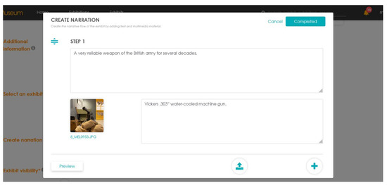 Figure 9). The narration is conceptualized with the help of the platform as a series of steps, each of which is assigned with a narration segment and a selection of media files. This is different from the physical exhibition, and it allows the curator to give a storytelling approach to the presentation of exhibits, or to exploit narratives to provide typical museum guide facilities.