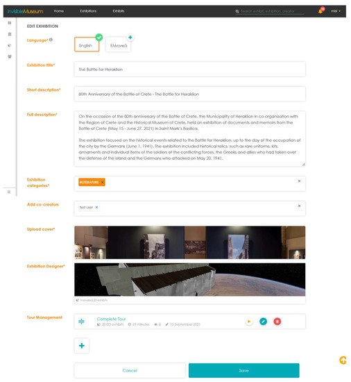 Figure 11. The main page of the exhibition allows for the authoring of basic textual information regarding the VEs, and the setting of language options for its availability. For the exhibition to obtain a virtual form, the design process should be initiated by loading the exhibition designer.