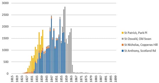 Bar chart of burials per year in selected central Liverpool Roman Catholic churchyards based on extant burial register data. No data survives for St. Patrick’s after 1841; the drop in burial for all churchyards follows the prohibition of burial except in existing family plots in a few sites.
