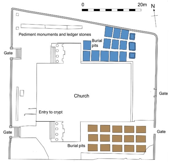 Plan of St. Patrick’s Church and churchyard, 2022, showing identified (blue) and inferred (brown) burial pits.