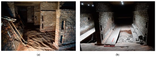 (a) Brick passage walls with pairs of rectangular slots in St. Patrick’s Church crypt. (b) An unexcavated rock-cut pit between the passage walls in St. Patrick’s Church crypt.