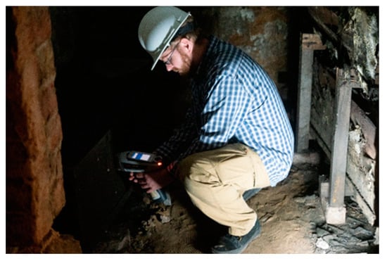 Each brick-lined vault at St. Patrick’s was recorded using tape measurements with sufficient reflector-less TST readings to integrate with the main crypt plan. Each coffin within the vaults was recorded using a standard record form and measurements were taken where possible for the outer wooden layer of what were, in nearly all cases, triple-shelled (layered) coffins, with a wooden outer and inner coffin and a lead intermediary layer. The positions of coffin fittings were marked on the record sheets, and coffins and their fittings were digitally photographed. In some cases, the fittings included inscribed breastplates that recorded the biographical details of the deceased. These are important in archaeological analysis, but also of great significance to the local community and the church congregation. The vaults were photographed to enable photogrammetric modelling, and all accessible fittings and the lead lining layer of the triple-shelled coffins was tested using PRXF (Figure 10).