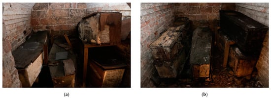 (a) View of Vault 3 containing coffins of the Bury family; (b) View of Vault 4 belonging to the Roberts family.