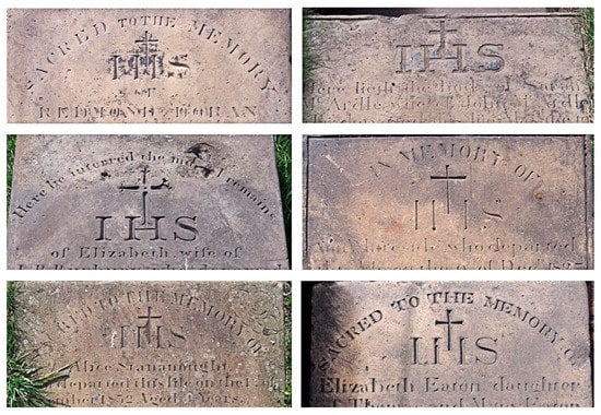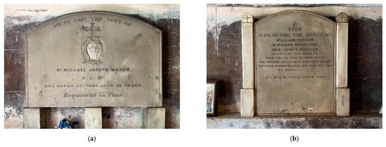 As the monuments at St. Patrick’s are relatively early Roman Catholic memorials in an urban English context, they provide a valuable insight into the similarities and differences with the majority Protestant memorials that were erected in Liverpool in the early nineteenth century, and they can be compared with contemporary Roman Catholic memorials commissioned in large numbers in Ireland. Two were small pedestal monuments, the most elaborate memorials in the burial ground, remaining in situ close to the boundary and visible from the main road. Much of the remaining area where memorials were allowed would have been covered with the ledger slabs, but some headstones survive because they have been moved into the crypt. These show the same symbolism as the ledgers but, as is so often the case elsewhere, they can have further elaboration [21,24]. The headstone for Thomas Maguire (died 1846) has a horizontal top, but it has incised a more elaborate shape which encloses the IHS set within the top of the design (Figure 15a). This shape forms the headstone profile for John Rooney (died 1841) and Mary Moran (died 1844, Figure 15b) and is a shape found across northeast Ireland, used by both Catholic and Protestant communities.