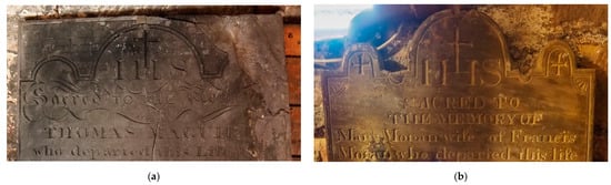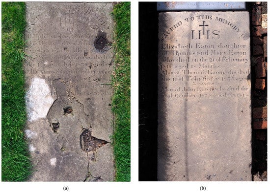 The survey has enabled those memorials permanently visible to be recorded, using a standard methodology [21,22]. Some others were only uncovered for a short time by the community volunteers and then were similarly archaeologically recorded prior to being placed back in the ground as there is insufficient space at present for them all to be permanently displayed. It is notable that some of those slabs that had been buried were in a much better state of preservation than those that had been exposed since their erection, indicating the level of erosion in this urban environment (Figure 14). More memorials lie beneath the surface in some parts of the burial ground and some of those already recorded lie on top of more than one more layer of slabs, but it was not safe to uncover them; their presence, however, suggests that a significant area of the burial ground may have been covered with such slabs, at least in the areas without burial pits.