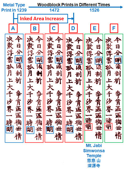 Figure 6 shows a bar graph of the sum of inked areas for 28 characters as a function of the printed versions A through F, in pixels. Two blue vertical lines were added to show the timing of printing technique changes (between the versions A and B) and entirely new woodblock duplication in 1526 for version E. The total inked area in the A version was measured to be 37,298 pixels and is the smallest of all versions. The total inked areas in versions B to D monotonically increased up to 47,479 pixels, which accounts for a 27.4% increase by thickening strokes caused by woodblock duplication between versions. The inked area measurement error is less than 0.5% of total area. The difference in inked area between versions is statistically significant. The change of inked area between versions is not from the wear and tear of the identical woodblock. The duplicated woodblock-printed versions of B to F are printed using newly duplicated woodblocks over 300 years, from the 13th to 16th centuries, as reported in previous studies [25,26,27].