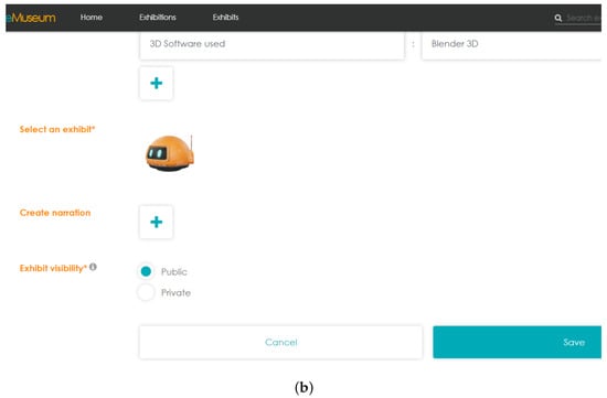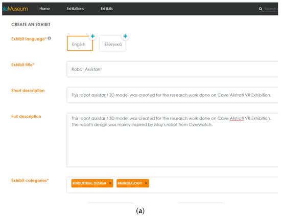 The work presented in this manuscript was developed for the purposes of the “Invisible Museum” (IM) platform [1], in order to offer a more robust experience to its users. The Invisible Museum itself is a web-based platform centered around the concept of bringing together the ever-increasing capabilities of VR and AR technologies with the cultural significance of physical museums. The central feature of the IM platform is the user-centered design of the human experience regarding museums, from touring exhibitions in digitally-designed museums, to creating one’s own museum space filled with exhibits of their own. Within the bounds of the platform, users can upload their own 3D rendered exhibits, embellishing them with narrations and pictures that enrich the history and character of a given exhibit, as presented in Figure 1a,b.