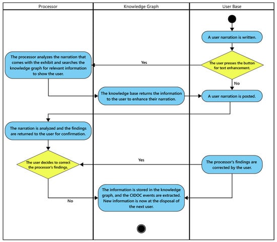 The full pipeline of the NLP4CH, consists of three major components: the processor itself, the knowledge graph of stored knowledge along with the schema that outlines the information detected and stored, and the user participation aspect. The end goal is a steady feedback loop between the system and the users, in which the system is constantly improved in its processing capacity and enriched with more information, and the users benefit from the system in order to enhance and connect their own narrations. The full pipeline is explained in broad strokes in Figure 4.