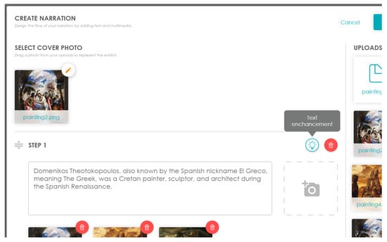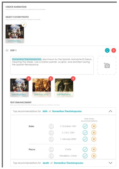 The online authoring of narratives on Cultural Heritage is a research subject that has gained the attention of many research works. One of the first approaches was the Narrative Building and Visualising Tool (NBVT), a software that allows users to construct and visualize narratives through a Web interface [19,20]. In the same context DanteSources, was a Web application that allowed free access to the knowledge about Dante Alighieri’s primary sources, i.e., the works of other authors that Dante cites in their texts [21,22,23]. Later approaches extended these works by providing a well defined methodology [24] and the appropriate tools to support socio-historic narratives and traditional craft processes as forms of Intangible Cultural Heritage (ICH) [3,4]. In the same context, another dimension studied is recipes as a form of ICH strongly connected to the place, community, and identity expressed as a collective narrative [2]. Finally, approaches have studied the possibility of integrating the conceptualisation of narratives to existing systems for CH representation such as Europeana [25].