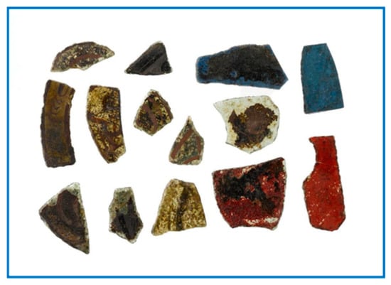Spencer’s ground-breaking thesis sampled 36 glass shards from this cathedral (Figure 1) (now in the custody of Historic Environment Scotland). These were broadly datable to the 13th century and as originating from most likely northern-French, or perhaps German, workshops. This coincides broadly with the refoundation and erection of this new bishop’s church in Moray from 1224 (relocated from nearby Spyny) or, at the latest, Elgin’s rebuilding after destruction caused by a major fire in 1270 [6,43]. A second rebuilding and repairs after a later fire and violent damage inflicted on the church in 1390, as well as developing patronal tastes/wealth, saw the cathedral greatly expanded and embellished, including the mid-15th-century installation of a larger, intricate east-end rose window: site custodians HES have recreated part of that choir feature window’s complex abstract tracery from surviving architectural fragments [44].
