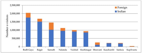 The 2017 tourism datasets prepared by the Ministry of Tourism, India are used here as this is the only year that most comprehensive data is available for most sites and something that can be compared. The largest share of visitors is concentrated around the ten most iconic places [23]. Shown in Figure 4, these ten places account for close to 11 million visitors; almost 87% tourists are domestic whereas foreign visitors account for less than 13%. The number of foreigners varied across the key sites of the circuit: from as few as 26,900 in Sanksia to as high as 430,000 in Sarnath and 280,000 in Bodhgaya. The varying numbers show that not all foreign visitors visit all the eight destinations in the circuit. Visitation is uneven: Bodhgaya, Sarnath and Lumbini have visible presence of foreigners whereas other sites have much lesser numbers. In fact, some other sites outside the popular circuit such as Nalanda attracts sizable numbers of foreigners. Most international arrivals are predominantly from Buddhist dominated countries (Sri Lanka, Thailand, Japan, Korea, and China). This could be because these are countries with high Buddhist populations and have monasteries in Bodhgaya and Lumbini–which means that visitors have assured lodging and boarding.