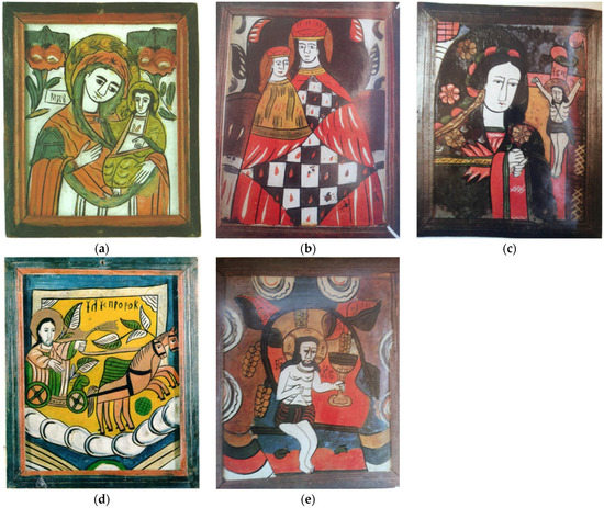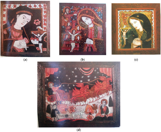 However, as the fame of the pilgrimage site grew, so did the demand for reproductions of the weeping icon. The first reproductions were offered for sale by traders from the West. Then the monks of the monastery began to make reproductions themselves [19]. Those are paintings on glass. The craft of glass painting, which appeared in 16th century Germany [28], was already widespread in the mountainous areas of Central Europe, “in Alsace, Bavaria, Switzerland, Tyrol, Upper Austria, then Bohemia, Moravia and Slovakia, as well as among the gurals in Tatra” [19] (p. 9). After a while the local peasants also learned how to paint, moving on from reproductions of icons of the Mother of the Lord to depictions of Jesus Christ and other saints (Figure 2). Nicula thus became a village of icon painters.