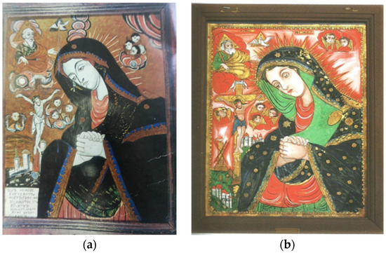 After the fall of communism in 1989, there was a revival of religiosity and a reconfiguration of the axiology in Romania. In the horizon of the post-secular rediscovery of the perenniality of religiosity [36], the Christian faith was widely re-assumed, and the prestige of churches and clergy increased dramatically. In this context, interest in icons, important tools for mediating the relationship of the faithful with God and the saints in the Orthodox Church, which dominated Romania, and in the Greek Catholic Church, which had returned to legality in December 1989, was revived. The icon kept in the Nicula monastery until 1948 was restored rather invasively [24,28] in 1991 at the National Museum of Transylvanian History and reinstalled, symbolically, in the monastery in 1992. Religious painting resumed its place in museums and, as timid personal initiatives first, then in an organized setting (in popular schools of arts and crafts, in NGOs and workshops alongside monasteries), the painting of glass icons was also resumed.