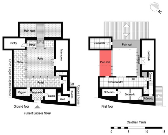 Finally, it usually had a staircase, stables, and sometimes direct access to the women’s quarter (servicio de mujeres). This was the case in the house in Guzmán el Bueno. This house had a casapuerta, stables, a reception area, and a servicio de mujeres with its own courtyard. Its reception area did not have a large area but was uncovered. Moreover, its shape and proportion resembled that of the Cruces 2 house since the casapuerta had the shape of a doorway, gave access to the stable (which had a mezzanine), and windows looked out onto it (