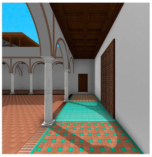 The ceilings were composed of painted beams, with arrocabes, chillas (thin board, whose width varies between 12 and 14 cm and two and a half meters long), and menados (geometric decoration in the alfarjes; complementary planks that cover the streets of the framework), the walls were decorated with white, green, and black small tiles in geometric motifs (alizares: small glazed tiles or azulejos), and the floor was olambrado and decorated with the immense almatraya as a reception carpet that extended to the outer edge of the portal, as mentioned before.
