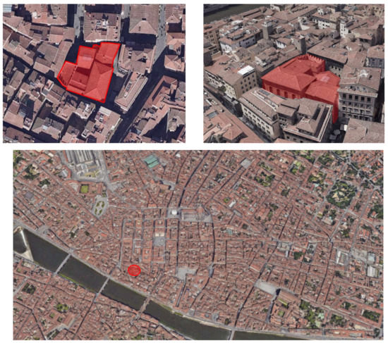 Location of the palace in Florence; the building is highlighted in red (source Google maps, Google Earth).