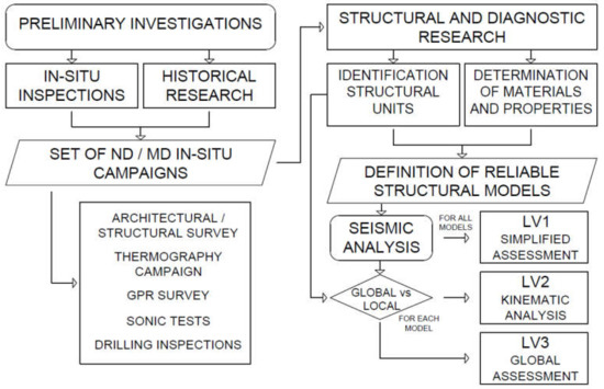 Beyond the methodologies for structural assessment, in the seismic vulnerability analyses of CHBs, the identification of the structural behavior and the determination of the mechanical properties of materials are crucial. In this regard, national and international codes require the development of specific cognitive paths [14,29]. The latter seek to understand the historical evolution of buildings in order to identify structural units to be evaluated. In this context, multidisciplinary research and expertise are required [30,31,32,33,34,35]. A relevant issue is covered by the in situ diagnostic campaigns [36,37,38], which can be divided into destructive (DT), minor destructive (MDT) and non-destructive techniques (NDT). While the first two approaches are preferred, their extensive application on CHBs with artistic value is discouraged. Therefore, MD and NDT are now widely used to characterize the structural features of CHBs [39]. Nevertheless, all the different tests have their shortcomings in terms of comprehending the historical evolution and the alterations that characterize the investigated structures [40,41]. If the historical evolution is well documented and the modification is traceable, it will be easier to perform effective experimental tests. However, the historical centers of European cities date to hundreds/thousands of years ago. Hence, the alterations and transformations that have occurred are not always traceable, when historical documentation is not available. In these cases, experimental tests can provide new information regarding structural features [42]. In situ campaigns can be planned based on the priority of each of the different tests. In [34], a funnel-shaped procedure for the structural characterization of CHBs defined dependent relationships between DT and MD tests. Namely, DT tests are extensively adopted to first characterize the investigated structure; then, MD tests are used on certain identified structural parts to validate the first assumptions and qualitatively characterize the applied technologies.