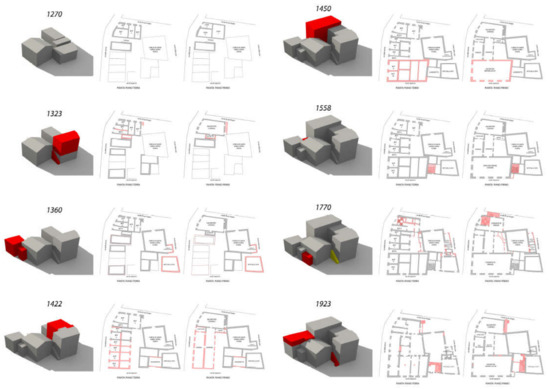 Summary of the transformations which occurred from 1270 to 1923. For each phase, the red parts indicate the spaces constructed during those years.