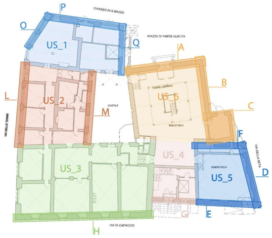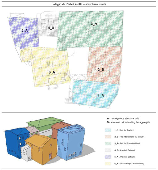 Identification of the structural units. The letter A indicates homogenous units, while B denotes units made to saturate the spaces. 1_A—Sala dei Capitani (XIV century); 1_B—First intervention in the XV century; 3_A—Sala di Brunelleschi; 4_B—Arte della Seta annex; 5_A—Arte della Seta main unit; 6_A—Ex San Biagio Church.