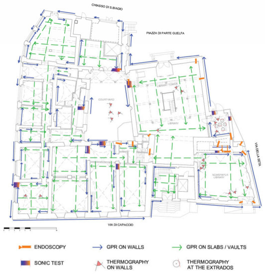 In this evaluation, only ND campaigns were executed, i.e., investigations that could potentially damage the building were not carried out. Especially when combined, ND techniques can provide satisfactory qualitative results [57,58]. In this work, ND tests were conducted extensively throughout the palace.