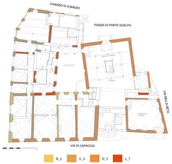 The structural units of the palace were investigated through four different ND techniques that, combined with the evidence of the architectural survey and the historical research, allowed us to determine the structural features of the building. From a vulnerability perspective, the masonry typologies defined initially after the GPR survey are associated with two current classifications described in the literature, i.e., one provided by the Tuscany Region [71] and the other from the Italian technical code [29] for the whole Italian territory. In Table 1, the two distinct nomenclatures are shown. It is worth noting that the classifications provided in the regional list do not entirely align with those outlined in [29]. In other cases, e.g., in modern masonry typologies, the Italian code lacks a specific classification for typologies characterized by resistant elements with block dimensions. In Table 2, the masonry typologies of the Palagio di Parte Guelfa are listed using both classification systems. In the case of masonry types B and C, the same MIT type, i.e., rubble stone masonry, applies. Further classifications of the different chaotic stone masonries used in medieval buildings in the Tuscany area can be found in [72]. In Figure 8, the layout of the building is presented. The different identified masonry typologies are attributed to the different walls; the dashed walls indicate the suppositions made according to the NT campaigns, while solid lines indicate panels verified with the endoscopy visualization.