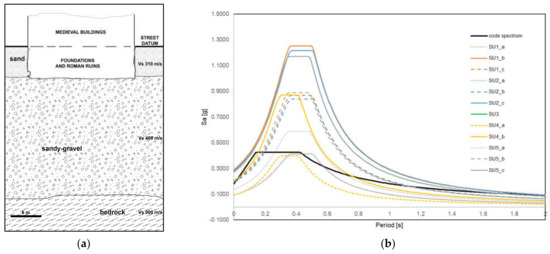 (a) Information about the soil velocity for the different layers according to soil class; (b) considered floor spectra for the different structural units of the palace.