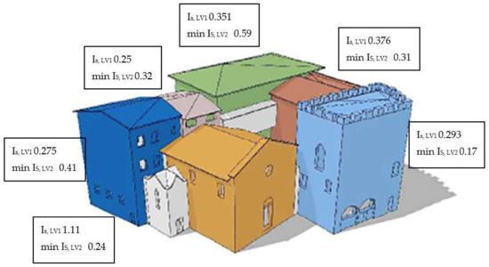where Axi,yi represents the resistant area of the i-th floor; τdi is the shear resistance of the masonry walls; is a coefficient considering the homogeneity of the stiffness and resistance of the bearing walls [14]; is related to the type of failure of the piers of the i-th level, i.e., 0.80 for flexural failure and 1.00 for shear; ki is the ratio of the seismic forces on the i-th floor and the total seismic force; and βxi,yi is a coefficient representing the planar irregularity at the i-th level, associated with the eccentricity between the barycenters of mass and stiffness of the system. The shear resistance was calculated on the basis of the masonry typologies identified in Table 2. The Italian Guidelines indicate that the computation of seismic acceleration has to be conducted for two directions and for the different levels. Later, the most vulnerable level and seismic direction indicate the final risk index value for the considered building.
