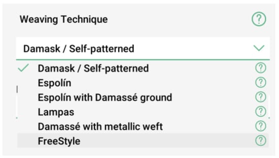 Functionality F03. Six different weaving techniques can be selected in the Image Processing Tab of the Virtual Loom. These techniques are (Figure 2): Damask / Self-patterned; Espolín; Espolín with Damassé ground; Lampas; Damassé with metallic weft; Freestyle. Depending on the technique, different options are available in the Virtual Loom (number of yarns, weaves, etc.), and the resulting 3D model will be different. Figure 3 shows examples produced for different weaving techniques based on the same input image and using two yarns. It is worth noting that only two zones (one for the background and one for the design) are considered in the three examples of Figure 3 so that they can be easily compared.
