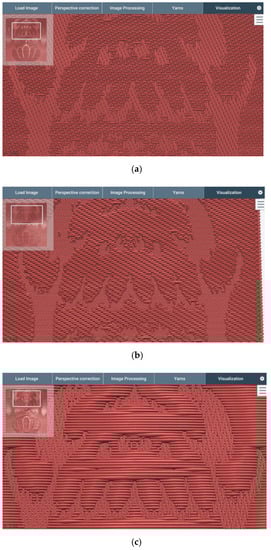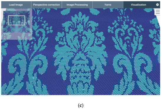 Using the Virtual Loom with an optimal input image: (a) selection of the area of the image; (b) selection of the yarns and colors to represent the ground and the pictorial part; (c) Resulting 3D model.
