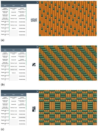Examples of applying different weaves in the Virtual Loom: (a) an irregular satin weave; (b) a twill weave; (c) an extended tabby weave.