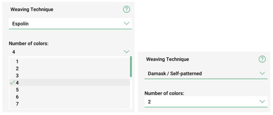 Functionality F06. In the Image Processing tab, the number of yarns, each corresponding to a color, can be adjusted using a dropdown menu (Figure 5). The number of colors that can be selected depends on the selected weaving technique. For instance, for damask, only two colors can be selected, as this technique involves only two yarns in the weaving process.
