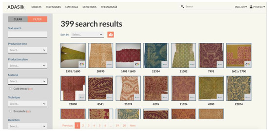 In the field of silk heritage, a few examples come to mind. In Europe, the model of the Fondazione Lisio stands out. It is an old silk factory founded by Giuseppe Lisio in Firenze in 1906 that has developed an interesting educational and cultural laboratory in order to keep alive the manufacturing heritage and the art of hand weaving silk, gold, and silver []. Regarding work shared among universities, textile companies, museums, and cultural heritage authorities, mention should be made of the Swiss project SilkMemory, linked to the Lucerne School of Art and Design. The result of the project is a web portal with textile sources from the Zurich silk industry [] that features a number of filters and research tools. Together with selected visual sources from the database, it brings new users and value to textile artifacts [].