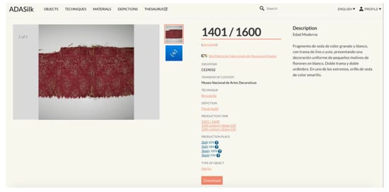 Furthermore, the fact that we have taken the first steps to integrate this collection into ADASilk facilitates its entrance to the digital arena. As the growing number of cases and examples in the literature shows, small and medium-sized institutions have adopted some schemes of digitization, open access, and interoperability for the information about their holdings []. These shared repositories ensure the practice of better cataloging and information management strategies while allowing them to increase their visibility. As mentioned, despite keeping some of the most important Sicilian clothing, the Piraino collection was not widely known. Making it easy to transfer data to the SILKNOW repository is already a major step that will guarantee a permanent exercise of access to Sicilian culture while helping to connect it with similar collections. The skills developed by interdisciplinary research can generate specific applications in the fields of design, industry, and technology in terms of the use of sustainable materials, research, and the development of innovative processes for product research and market development.