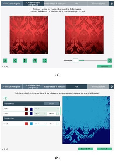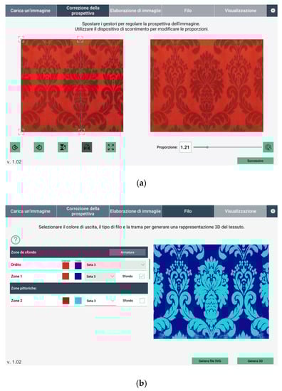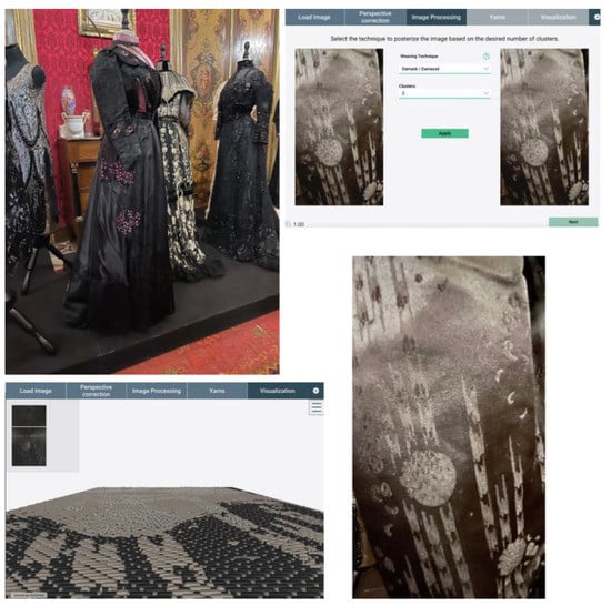 - From a technical point of view, the user found that for the Virtual Loom to be even more fruitful, the loaded images must be gathered in specific ways, taking special care of the incident light. Some photographs can become practically unusable because the original image has a different brightness space due to the reflection of light on the fabric. This prevents a faithful 3D reconstruction of the top of the photographed piece of fabric (Figure 10). Thus, as an experienced user in his field, after his initial use of the tool, he was able to determine how the images in the collection should be created for proper and efficient 3D reconstruction in the Virtual Loom. Adding a symmetrical piece of a textile, if the design has a symmetrical axis, is a functionality for reconstructing partially damaged fabrics or incomplete images [].