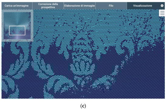Using the Virtual Loom with a non-optimal image: (a) selection of the area of the image; (b) selection of the yarns and colors to represent the ground and the pictorial part; (c) Resulting 3D model.