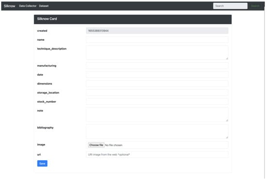 In this way, the application allows the creation of a record that is simplified in content, but still contains all the basic information needed to identify a textile artifact. In particular, the “Notes” field allows ADASilk’s intelligent search engine to link the artifact to other similar artifacts. The stylistic notes contain decorative modules to better identify the uniqueness of the artifact. The notes are accompanied by a bibliography, if the artifact is unpublished, and photographs taken at the site where the artifact was found. The resulting dataset is then converted to a JSON file and imported into the Knowledge Graph. The main advantage in using this application is the simplicity and speed with which museum collections can be cataloged, as shown in Figure 13.