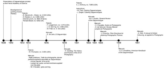 Figure 1. Timeline of different patents and manuals with information regarding coloring of daguerreotypes.