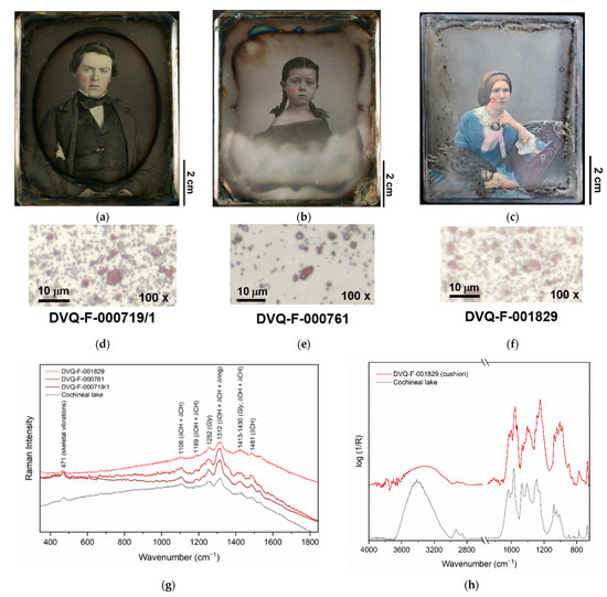 Figure 2. Positive photograph of daguerreotypes (a) DVQ-F000719/1, (b) DVQ-F000761, and (c) the left plate of the stereoscopic daguerreotype DVQ-F-001829 courtesy of Fondazione Alinari per la Fotografia. The analyzed areas of the flesh are marked with a red circle. The micro-photographies in (df) show the distribution of the lake particles deposited over the plate surface. (g) Raman spectra obtained from the red particles in (df) compared to a reference of cochineal lake. The characteristic bands with their assignment [26,27] are indicated. (h) the μ-rFTIR spectrum of cochineal lake detected in the cushion in DVQ-F-001829, the area analyzed is marked with a white circle in (c), compared to the reference of cochineal lake.