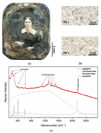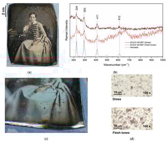 On the hand, in the other two daguerreotypes (DVQ-F-001667 by Millet—Figure 3a and DVQ-F-002339 by McGlees & Germon), the flesh tones were obtained with iron oxide (Fe2O3, called light red in the manuals) as identified by Raman spectra (data from DVQ-F-001557 as an example reported in Figure 3b). This pigment was considered the best to represent flesh color, as mentioned by Snelling (1849) [13].