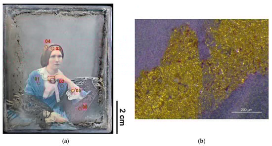 A less commonly employed pigment in daguerreotypes, vermillion (HgS), was identified in Dag534 from the Chiesa-Gosio collection, as confirmed by Raman spectroscopy (Figure A2a). The color in flesh tones in this daguerreotype is not very intense. Indeed, the manuals suggest avoiding the application of cinnabar or vermillion due to the possible damage that this pigment can induce to the plate [16]. In the same area where the particles of vermilion were identified, particles of a mixture of synthetic organic pigments (SOPs) were found. The Raman spectrum (Figure A2b) indicates the presence of a phthalocyanine pigment mixed with another SOP not fully identified. These colorants, commercially introduced in the 1930s [36], are anachronistic to the historical period when daguerreotypes were realized. Therefore, they can be associated with the re-application of color to recover the original decoration that was highly degraded. Finally, Prussian blue was identified in several of the daguerreotypes studied but only in the blue garment of the sitter of the daguerreotype DVQ-F-001829 was it applied alone.