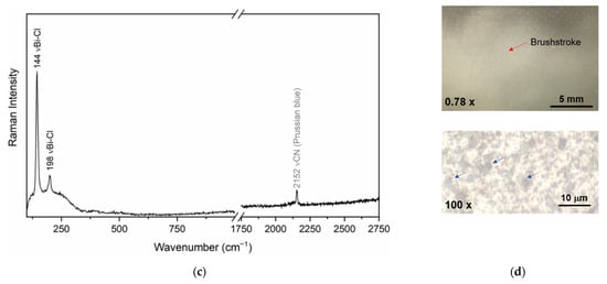 Moreover, the hair color was achieved by mixing indigo and another organic yellow pigment not fully identified (Figure 7c,d). Moreover, a weak signal from Prussian blue was identified (Figure 7d) and confirmed by analyzing in detail a blue particle (Figure A3). Snelling [13], in his manual, suggests the addition of blue pigments in the root of the hair and forehead of women with light or auburn hair, as is the case of the woman portrayed in the daguerreotype analyzed.