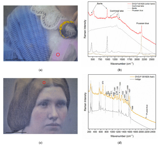 Figure 7. Micro-photographs of the daguerreotype DVQ-F-001829 by Claudet at 0.78× of the (a) pink collar and (c) head. The red circle indicates the area analyzed where the Raman spectrum reported in (b,d) shows the mixtures used for coloring the pink collar (i.e., cochineal lake, barite, and Prussian blue?) and the hair (i.e., indigo, Prussian blue, and an organic yellow pigment).