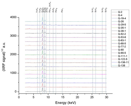 The main elements detected in the alloys, in different proportions, are Cu, Zn, Pb, As, Sn, Sb, Fe. Environmental elements such as calcium, strontium and potassium were detected but not considered for classification and analysis (see Figure 2)