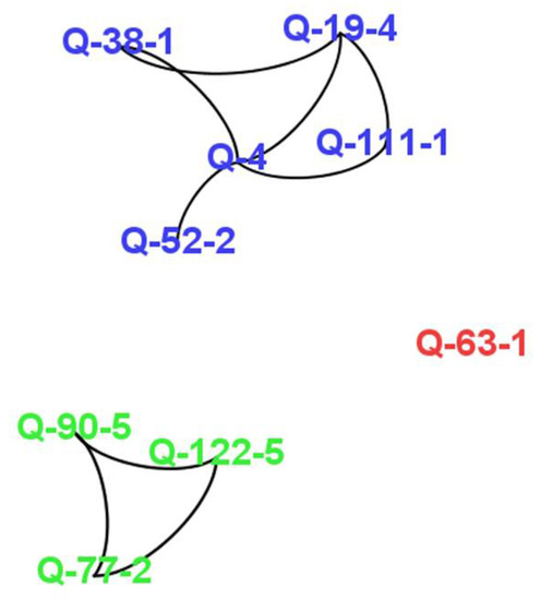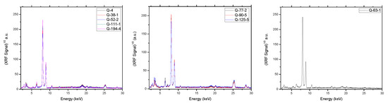 The GC algorithm clearly distinguishes three clusters, corresponding to the samples Q-4, Q-19-4, Q-38-1, Q-52-2, Q-111-1 (Cluster 1), Q77-2, Q-90-5, Q-122-5 (Cluster 2) and Q-63-1 (Cluster 3). The reliability of the output of the GC algorithm can be visually checked comparing the XRF spectra of the samples in the three clusters (see Figure 4)