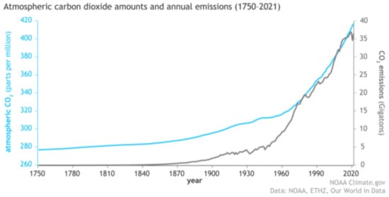 Increasing behavior of carbon dioxide in the atmosphere (blue line) associated to human emissions (gray line) since 1750 (start of the Industrial Revolution) until 2021. Credit: NOAA Climate.gov.