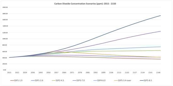 Concerning atmospheric pollution, Figure 3 shows the evolution of the concentration of carbon dioxide in the atmosphere from 2015 to 2150 for several scenarios; see [37]. We can observe that, in the near future (up until 2050), the carbon dioxide concentration keeps increasing under all scenarios; the rate of increase differs for each scenario. However, after at least 2050, some scenarios foresee a slow decrease in concentration; in a few cases, the concentration of carbon dioxide in 2150 will be equal to the concentration in 2015.