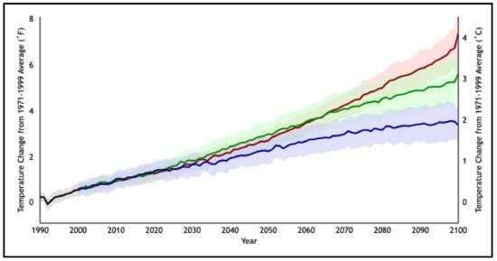 Climate change also acts on the global temperature, since the amount of water vapor in the atmosphere is changing, which has potentially significant effects. Over the last few decades, global warming has been observed and studied and, correspondingly, climate models have been developed. Climate scientists foresee that the Earth has a high probability to continue to warm over this century and beyond, with a corresponding increase in temperatures [3,4]. Indeed, global warming is caused by the growth in carbon dioxide emissions associated to the presence of other harmful gases produced by human activities. According to a wide range of climate model simulations [38,39], the global average temperature could be between 1.1 and 5.4 °C warmer in 2100; see Figure 4. Such scenarios are the results of projections, but it is also possible that greenhouse gas concentrations may increase at higher rates with respect to those indicated in the graph. In fact, carbon dioxide emissions are increasing at a rate of more than 3% per year; if the rate would maintain the same level, in the future, the carbon dioxide concentration in the atmosphere would exceed the scenario depicted in red by the end of this century or even before.