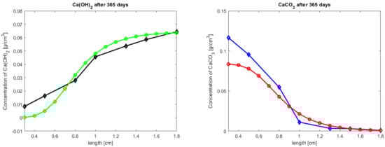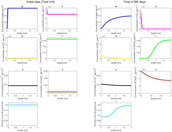 In Figure 5, we report the plots of the profiles of the quantities obtained by the mathematical-based algorithm described in Section 3 assuming parameters reported in Table 2. In particular, the left picture shows the system behavior at , when the diffusion of gaseous has already taken place in the cement matrix and the carbonic acid formation reaction has just begun, whereas, on the right, the situation at 365 days is depicted.