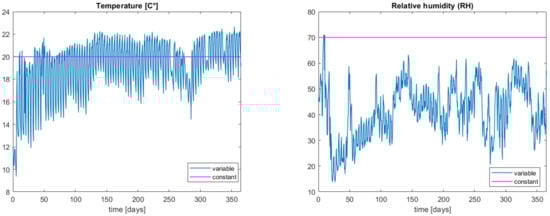 where temperature T and relative humidity can be time-dependent if we consider real environmental settings. If instead, we refer to the experimental settings such as those reported in [22], we assume a relative humidity of % and temperature °C.